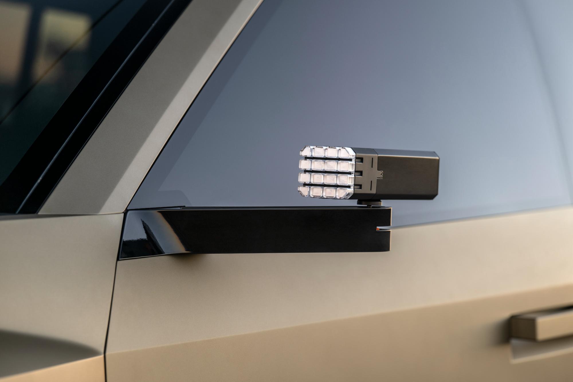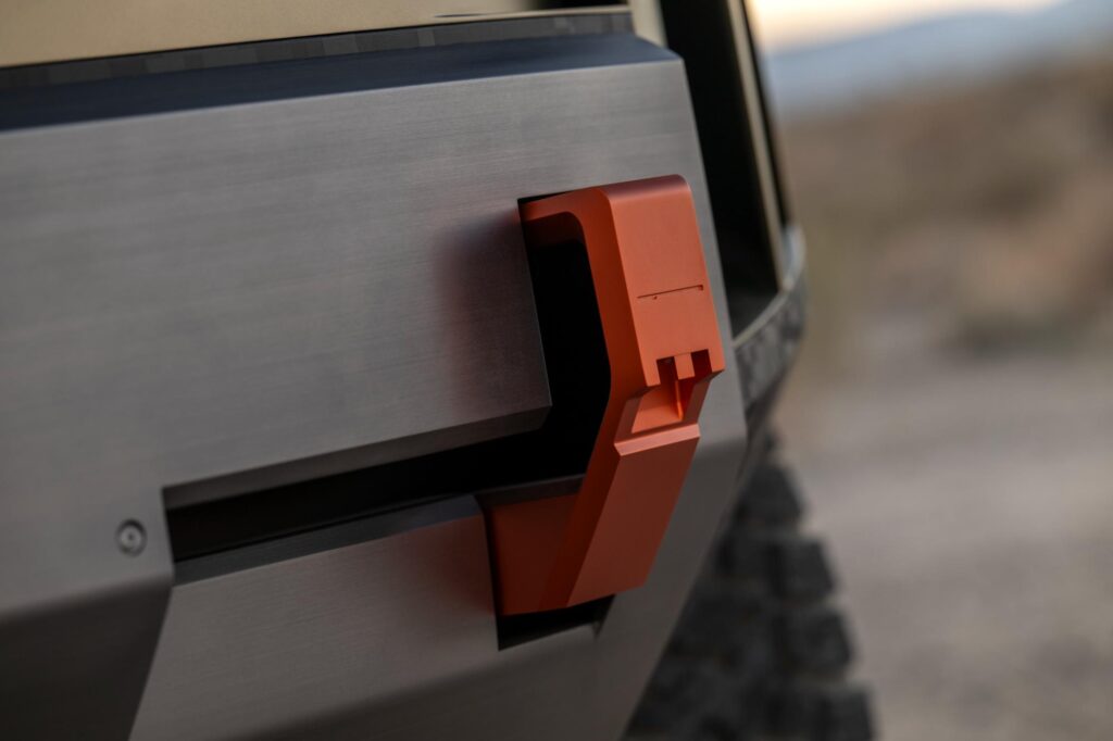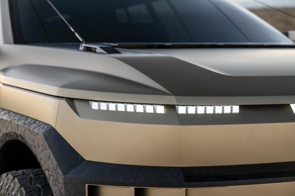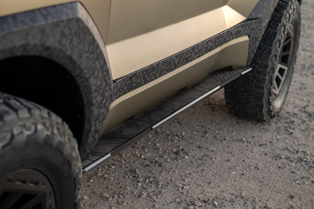 De asemenea, bara față integrează un scut protector care se prelungește sub caroserie pe întreaga lungime, protejând sistemul electric și suspensia în situații dificile. În zona aripilor apar panouri de protecție colorate distinct, iar pe plafon sunt montate patru proiectoare LED suplimentare, alături de un suport pentru accesorii. Spatele mașinii reia tema designului frontal, cu lumini LED pixelate, un scut de protecție masiv și prize de aer.