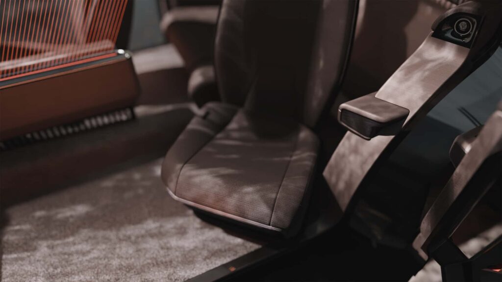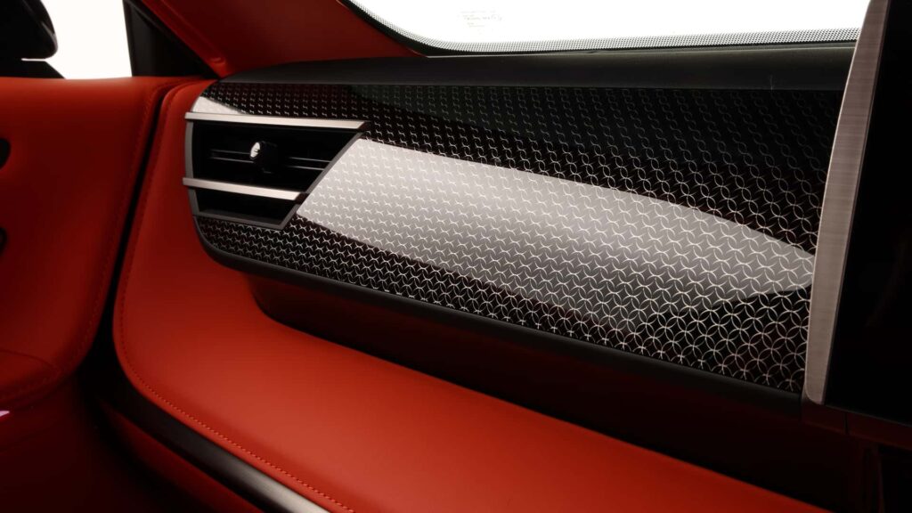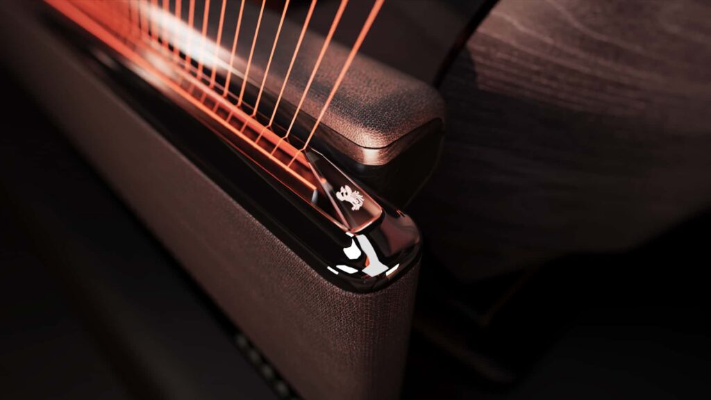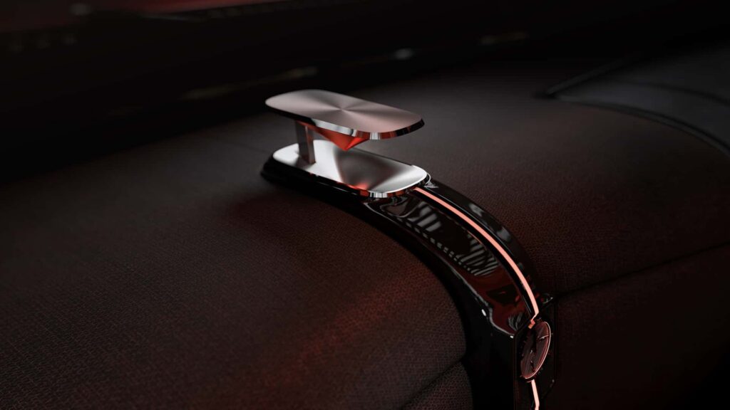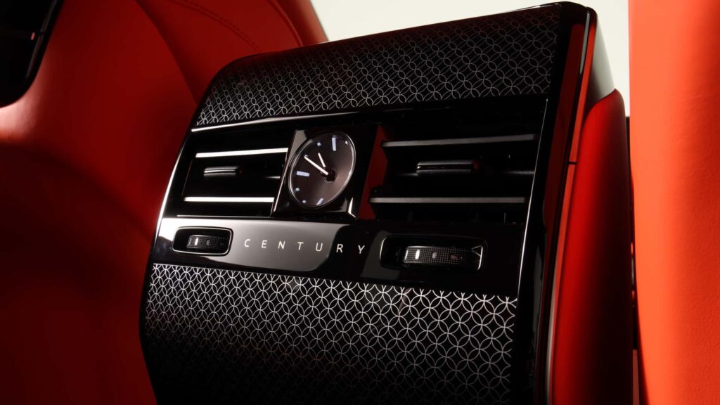 Absența montantului central (B) oferă o deschidere amplă care facilitează accesul în habitaclu, în timp ce scaunele din spate rotative adaugă o notă de versatilitate și confort specific automobilelor de lux. Tot în spate se remarcă o serie de detalii artizanale, cum ar fi inserțiile decorative unice și ceasurile analogice, elemente ce evocă rafinamentul limuzinelor clasice.