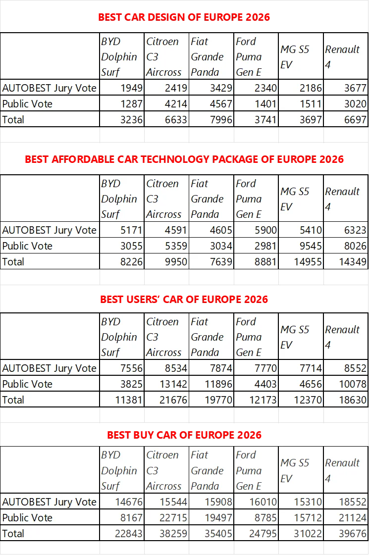 Titlul suprem, care celebrează a 25-a ediție AUTOBEST, a revenit modelului Renault 4. Într-o finală plină de tensiune, Renault 4 a confirmat consensul dintre experți și public, obținând 39.676 de puncte. Pe podium au mai urcat Citroën C3 Aircross (38.259 puncte) și Fiat Grande Panda (35.405 puncte). Victoria legendarului „R4” confirmă forța moștenirii mărcii (heritage), relevanța sa actuală și pregătirea pentru viitor. Premiul a fost acceptat de John Cleworth, VP Commercial Launching Operations, Renault.
