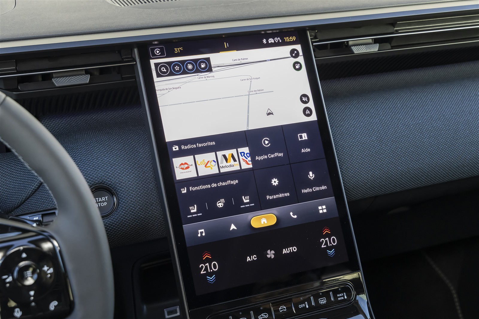 Însă cea mai spectaculoasă apariție este „waterfall screen” – ecranul care plonjează ca o „cascadă” de pe planșa bord pe consola centrală. Chiar dacă nu este o premieră mondială, este o apariție vizuală inedită și ergonomică, oferind cam tot ce ai nevoie „la mână” – la propriu. Că găsim o „cascadă” de acest gen la Mercedes, de exemplu, este până la urmă un compliment pentru Citroen C5 Aircross. Avantajul unei „tablete” verticale este că se pot etaja diversele informații / meniuri de care ai nevoie sau pe care le preferi. Este o realizare care ne-a încântat în timpul testelor noastre din Mallorca cu noul C5 Aircross. Sigur că ai nevoie de ceva timp să te adaptezi la „geografia” sistemului, dar odată învățat, totul devine super plăcut. Deasupra capului avem un panou de sticlă impresionant, de peste 1 m, care îți oferă cel mai frumos cer – dacă ai noroc cum am avut noi în Mallorca.