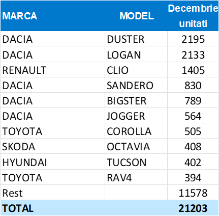Top 10 înmatriculări autoturisme – Modele (decembrie 2025)