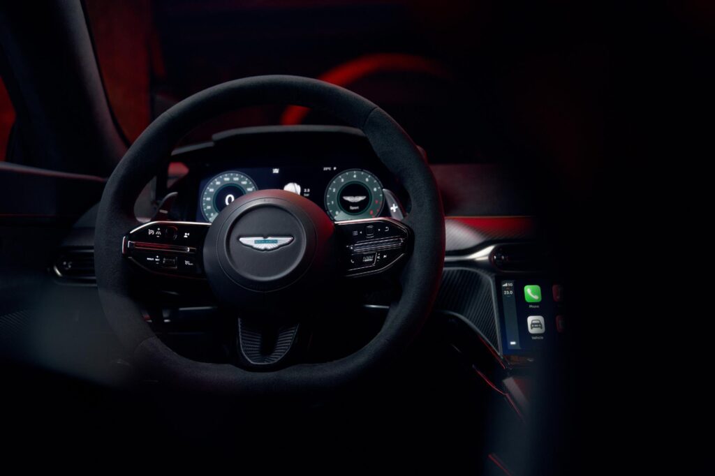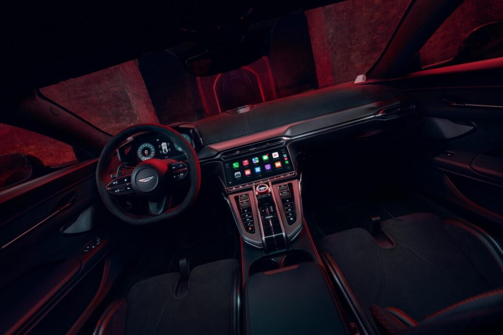 Cabina oferă un mix reușit între sportivitate și lux. Echiparea standard oferă tapițerie din Alcantara combinată cu piele, cusături contrastante și inserții de fibră de carbon. De asemenea, emblema Aston Martin este brodată pe tetiere, iar sigla „S” apare pe spătarele scaunelor. Cei care preferă o abordare mai rafinată pot opta pentru pachetul „Inspire Sport”, care include tapițerie din piele perforată, materiale premium și un ambient mai orientat spre confortul de zi cu zi.