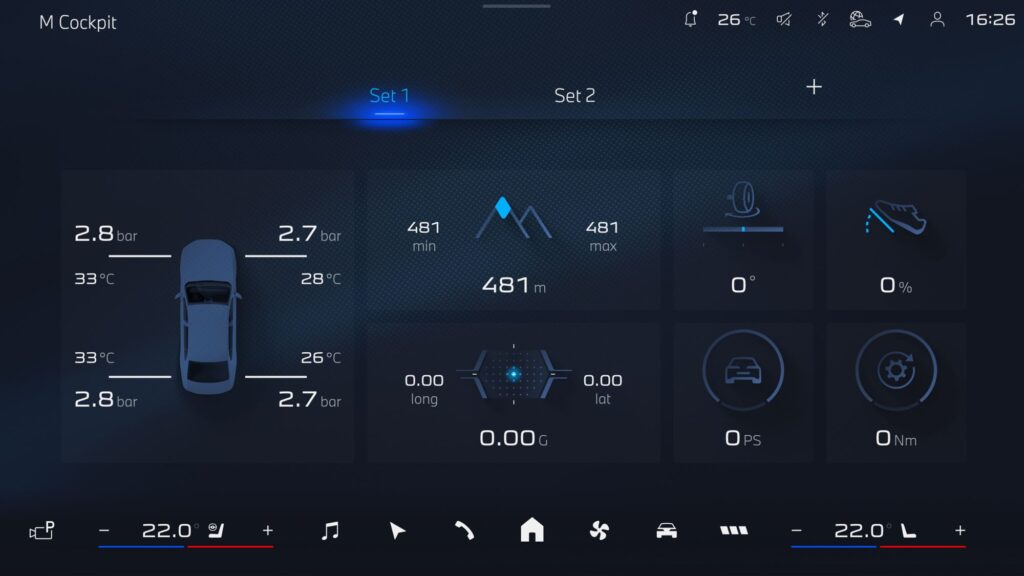 Prima dintre aplicații, denumită M Cockpit, introduce o interfață complet nouă pentru afișarea datelor legate de comportamentul dinamic al mașinii. Șoferii pot consulta informații despre șasiu, sistemul de propulsie, parametri dinamici și date geografice, toate reunite într-un format modern și clar. Aplicația permite personalizarea ecranului central prin selectarea a până la cinci tipuri diferite de afișaj.