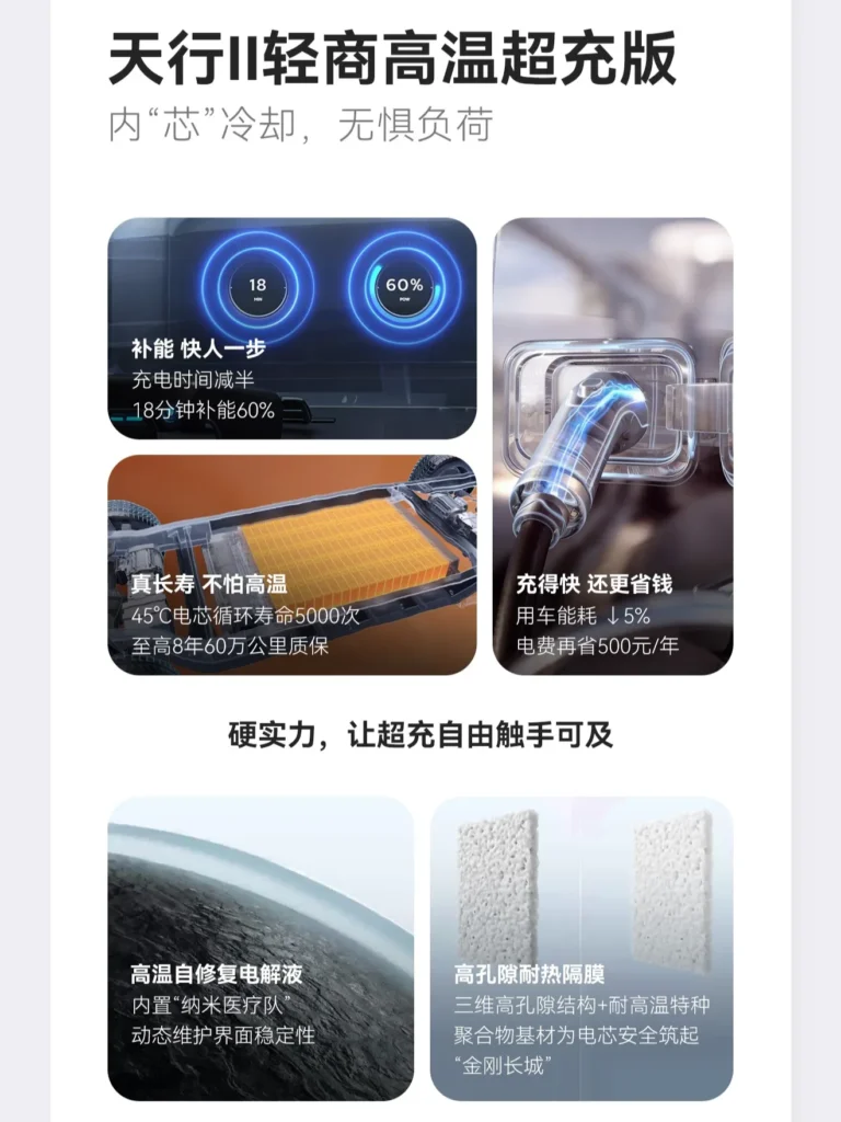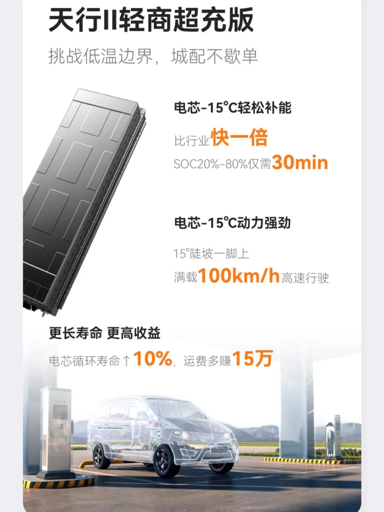 Bateria cu ioni de sodiu are o capacitate de 45 kWh și poate fi încărcată fără restricții chiar și la temperaturi foarte scăzute, de până la –30 °C. Producătorul afirmă că bateria păstrează aproximativ 90% din capacitatea sa utilizabilă chiar și la –40 °C. Densitatea energetică este de 175 Wh/kg, iar durata de viață depășește 10.000 de cicluri de încărcare. În plus, bateria este certificată conform noului standard național GB 38031-2025.