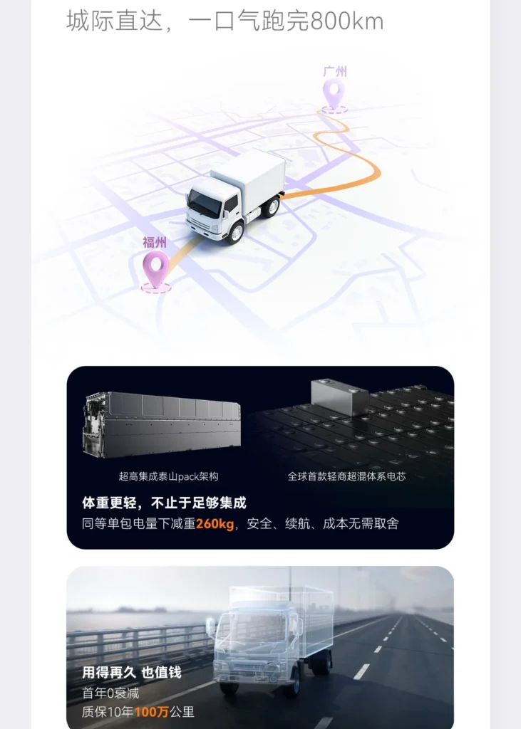CATL a prezentat o baterie cu ioni de sodiu destinată vehiculelor comerciale ușoare și, potrivit informațiilor apărute în presă, intenționează să înceapă producția de masă a acestui nou tip de baterie chiar în cursul acestui an. Bateria pe bază de sodiu are o capacitate de 45 kWh și este concepută pentru autoutilitare de mici dimensiuni și mini-camioane.