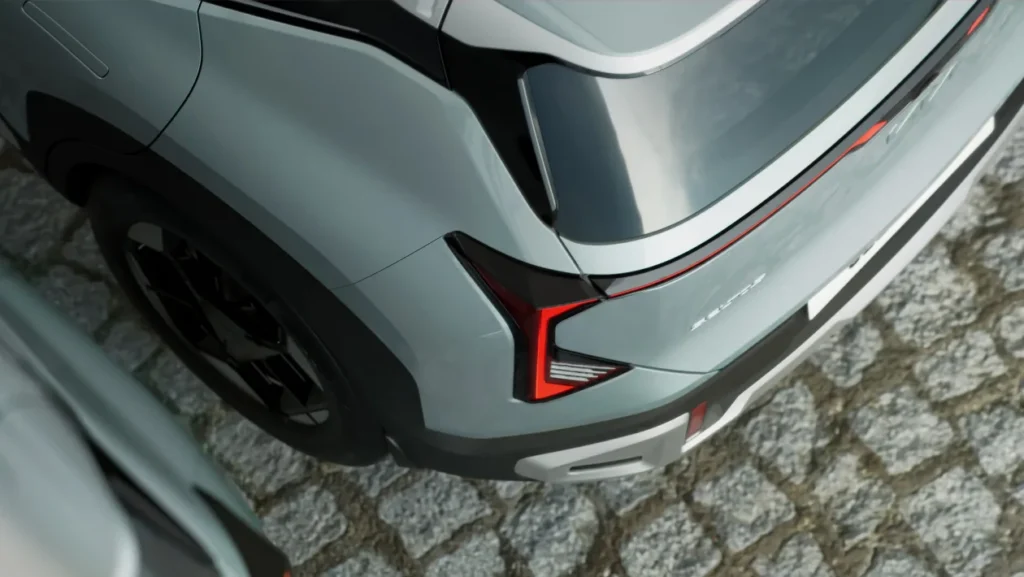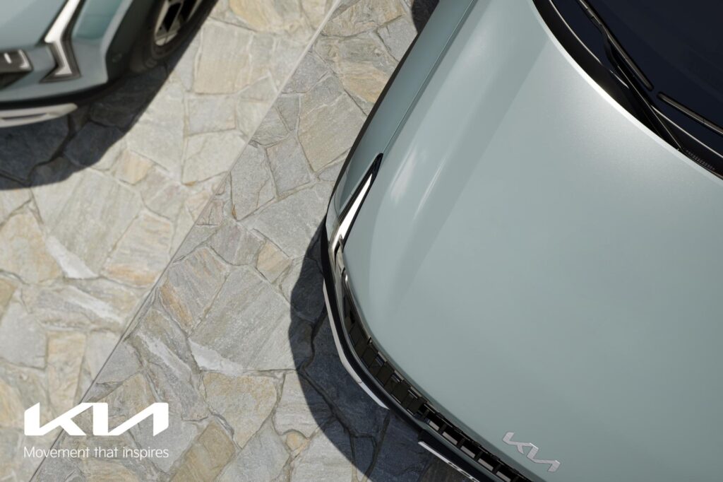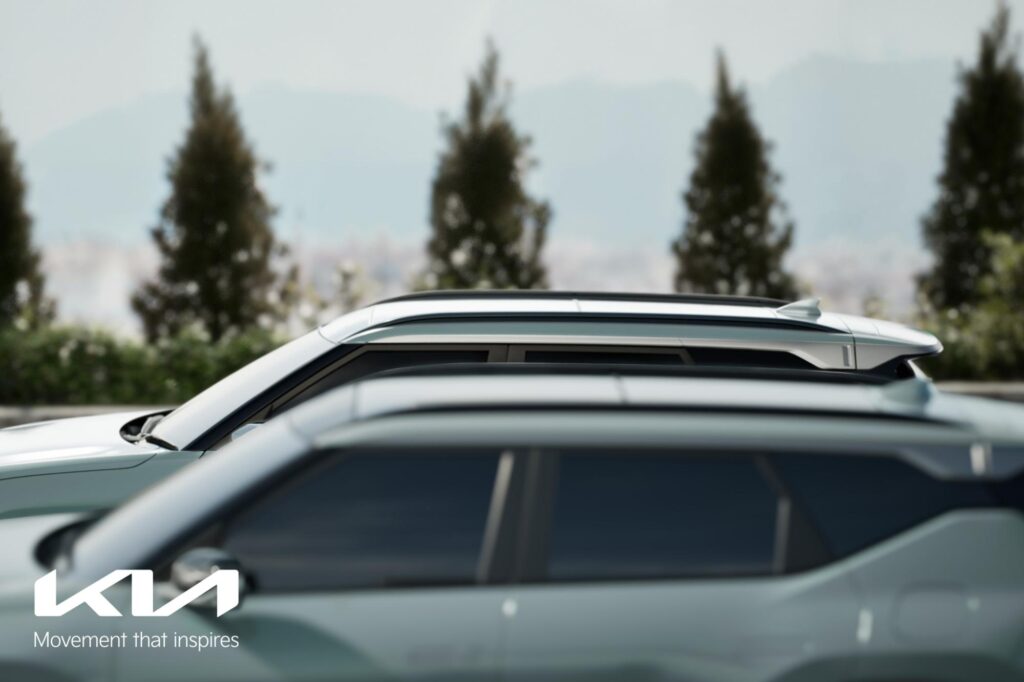 De asemenea, se pot observa și câteva elemente în nuanță de aluminiu în zona inferioară, ceea ce conferă mașinii un aspect mai robust. Același finisaj se regăsește sub barele de plafon și deasupra zonei vitrate închise la culoare, creând efectul de acoperiș „plutitor” și îngustând vizual zona stâlpului D pentru un aspect mai atletic în partea din spate. Aripile proeminente, cu arcadele roților de formă pătrată, se integrează în designul general și sugerează capabilități off-road. În acest sens, KIA a confirmat revenirea nivelului de echipare X-Line, alături de versiunea GT-Line.