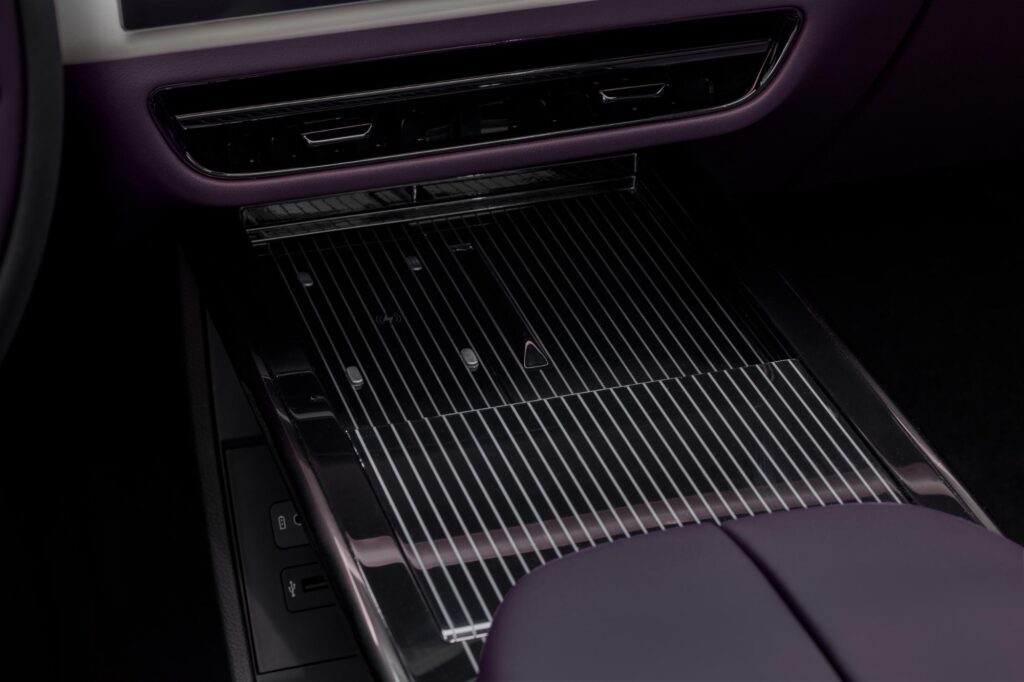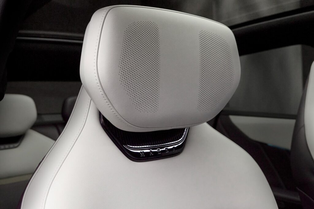 De asemenea, echiparea de bază include plafon panoramic, iluminare ambientală configurabilă în 256 de culori și difuzoare Bluetooth integrate în tetierele scaunelor. Sistemul audio dispune de 23 de difuzoare și de un amplificator de 1.280 W. În plus, SUV-ul electric beneficiază de comenzi vocale avansate și control prin gesturi. Interiorul poate fi configurat în trei combinații cromatice: Warm Beige, Maztex Black sau Amethyst cu alb Maztex.