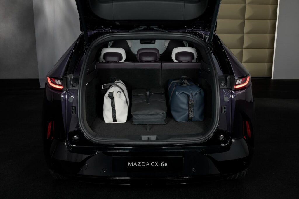 Ca gabarit, Mazda CX-6e are 4.850 mm în lungime, 1.935 mm în lățime și 1.620 mm în înălțime, la un ampatament de 2.902 mm. Portbagajul spate are un volum de 468 de litri, extensibil până la 1.434 de litri, iar în față există un frunk de 80 de litri. Aspectul exterior este completa de jante de 19 inch în versiunea Takumi, care sunt oferite standard. Echiparea Takumi Plus beneficiază de jante de 21 inch.