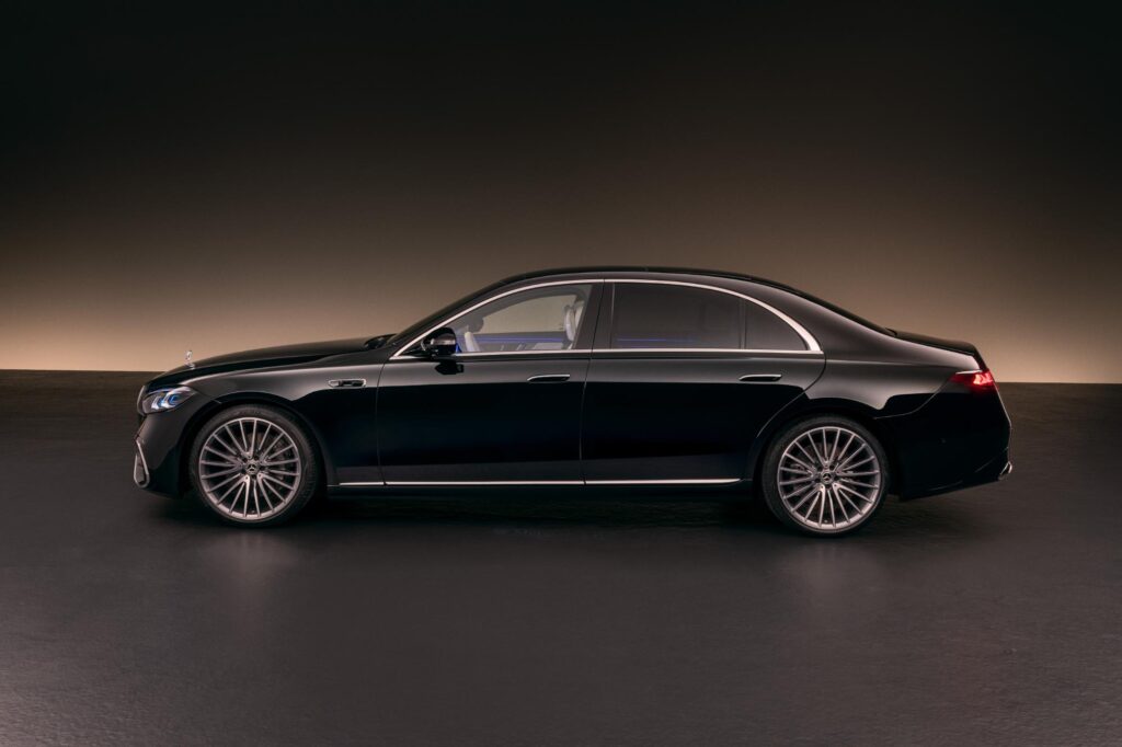 În partea din spate, stopurile adoptă o grafică nouă, cu trei stele iluminate integrate în elemente cromate. Un detaliu spectaculos este proiectorul montat în ornamentul pragului lateral, care afișează sigla Mercedes-Benz pe asfalt la deschiderea portierelor.