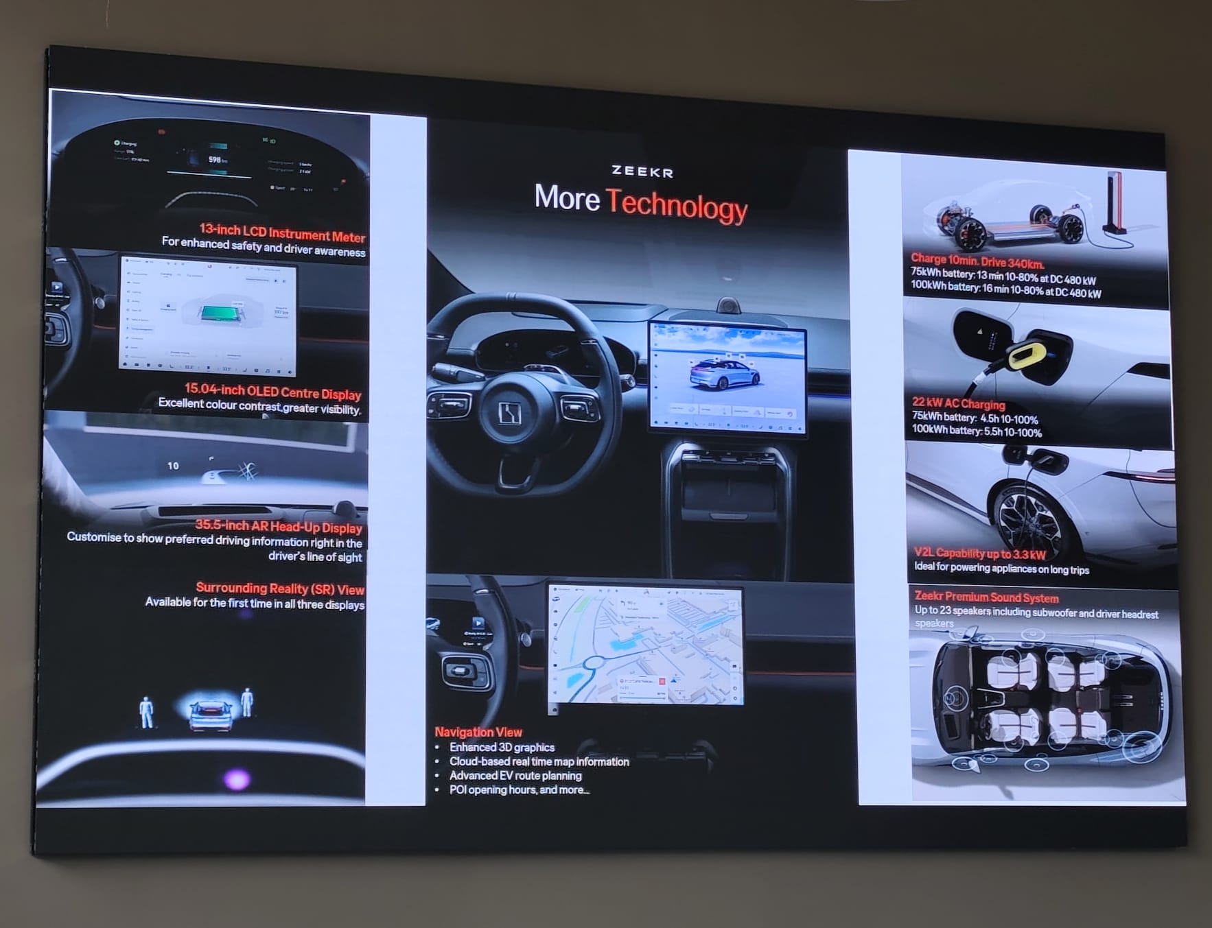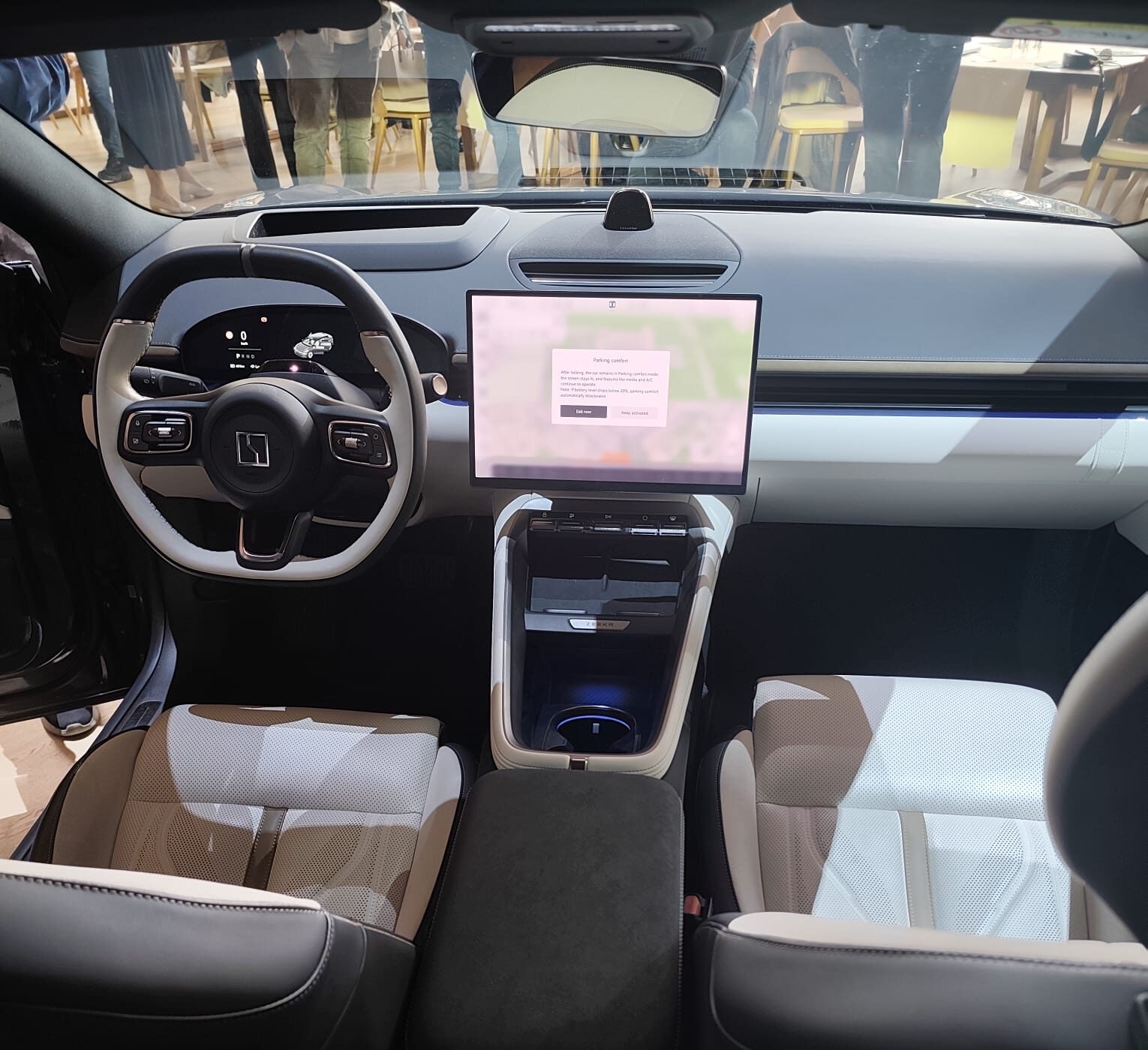 Chiar și versiunea de bază vine bine echipată, oferind un interior cu materiale premium, inclusiv piele ecologică, un ecran central de 15 inch și un instrumentar digital de 13 inch. Sistemele de siguranță includ faruri Matrix LED și pachetul Zeekr Assisted Drive, capabil inclusiv de parcare automată. Nivelul Long Range adaugă un plus de rafinament: head-up display cu realitate augmentată de 35,5 inch, sistem audio de 2.160W cu 23 de difuzoare și materiale superioare pentru interior, inclusiv inserții din piele Nappa.