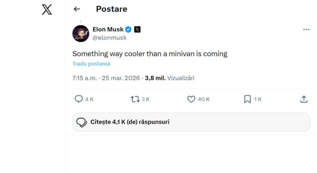 Pe 24 martie, CEO-ul Tesla a menționat pe platforma de socializare X (foto sus) că bancheta spate a Cybertruck-ului este suficient de mare pentru trei scaune de copii sau pentru trei adulți. Un utilizator i-a sugerat să producă un minivan, iar Musk a răspuns: „Urmează ceva mult mai cool decât un minivan”.