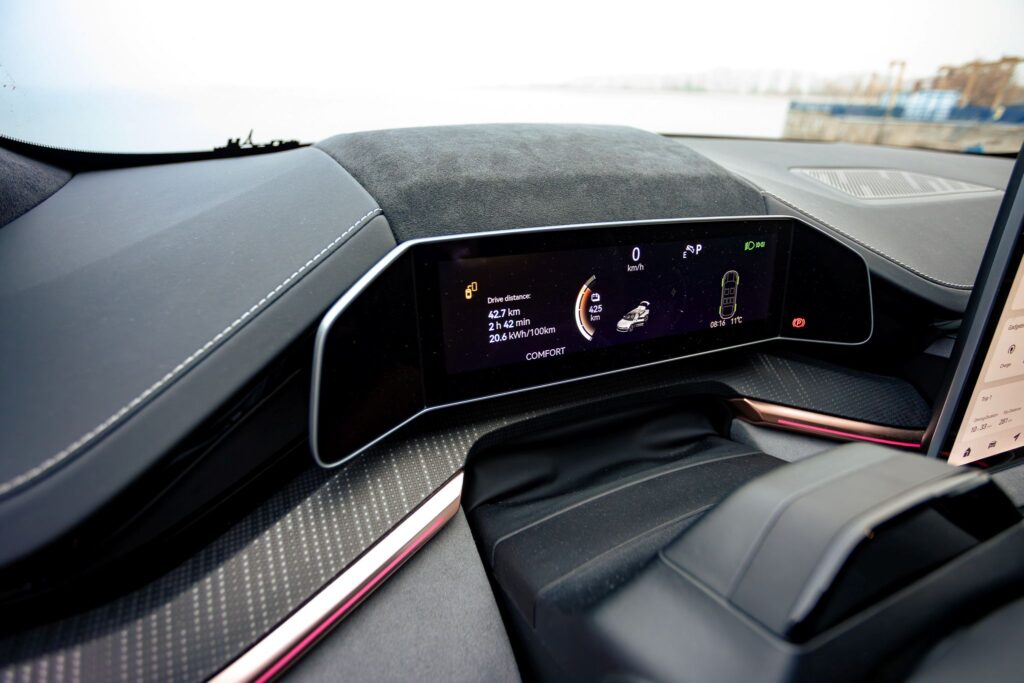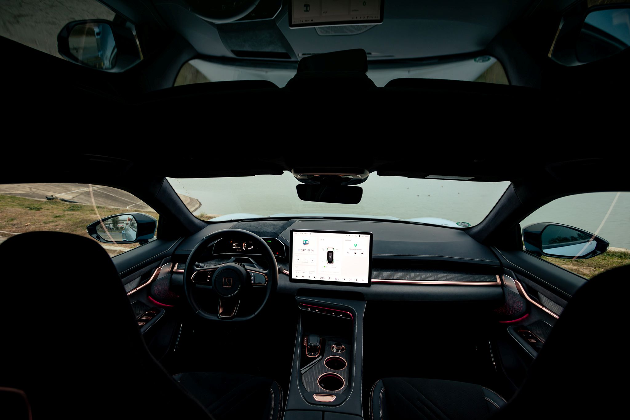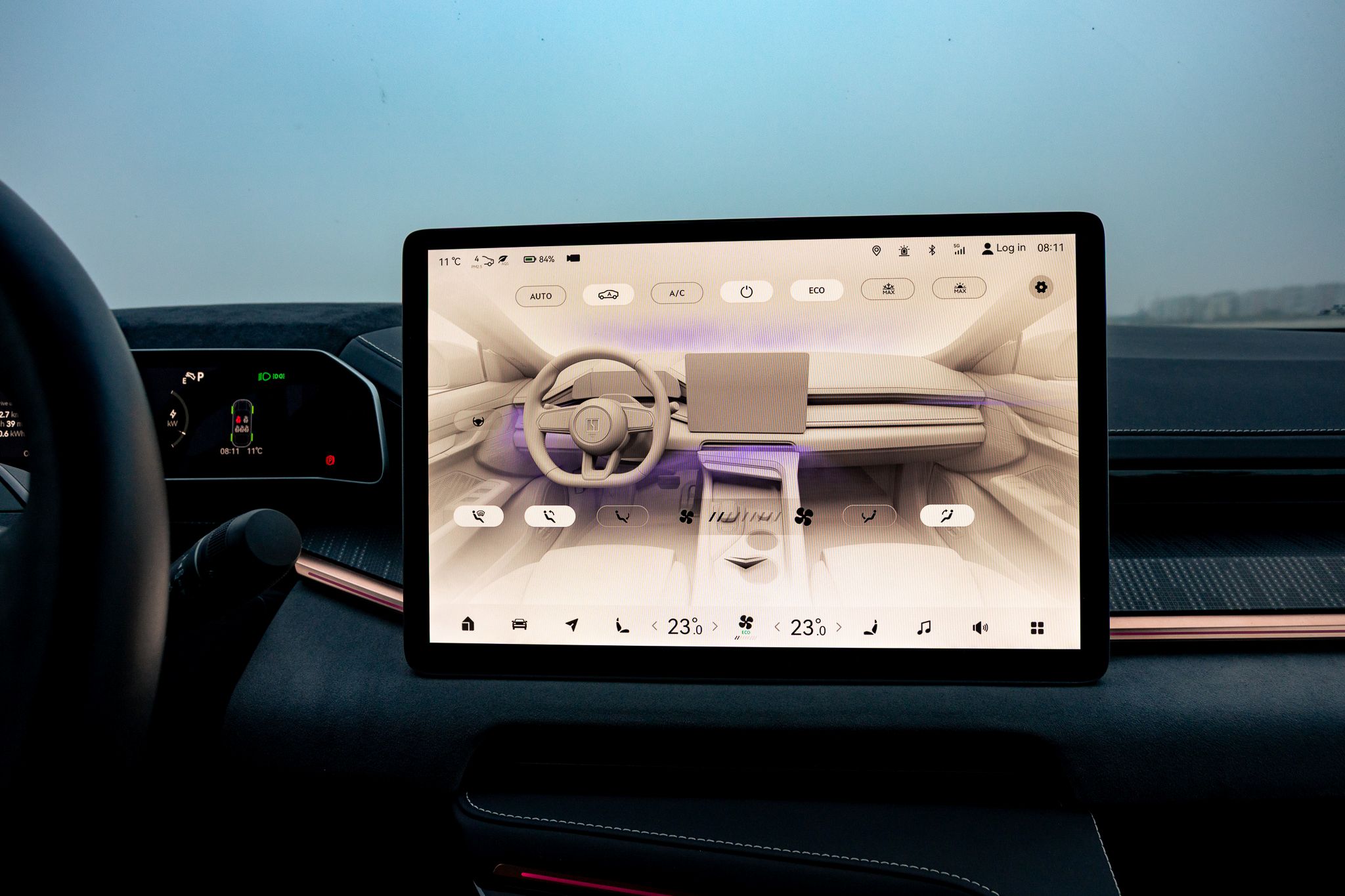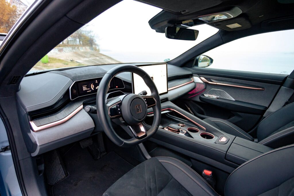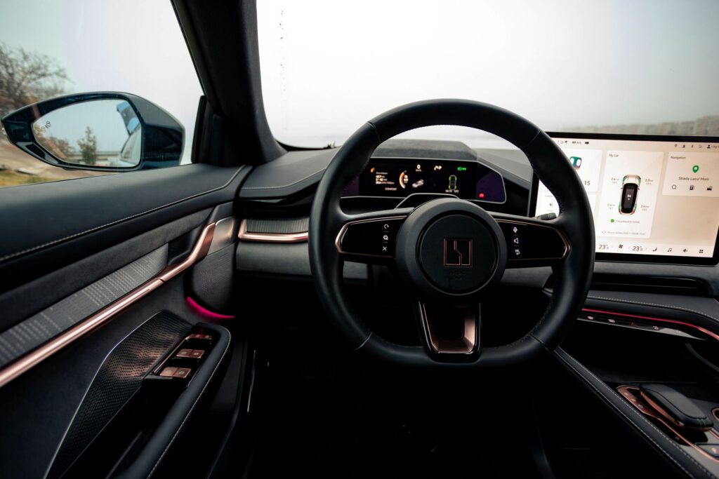 Volanul multifuncțional este prevăzut cu două pad-uri cu feedback haptic, care controlează oglinzile și poziția afișajului head-up de 14,7 inch. Acestea își schimbă funcționalitatea în funcție de ceea ce faceți, au un aspect plăcut, dar, din păcate, nu sunt marcate clar și există șanse să te încurci în ele mai ales în timpul deplasării. Un alt neajuns ale lui 001 constă în anumite meniuri ale uriașului display central de 15,4 inch, care sunt greu de găsit.