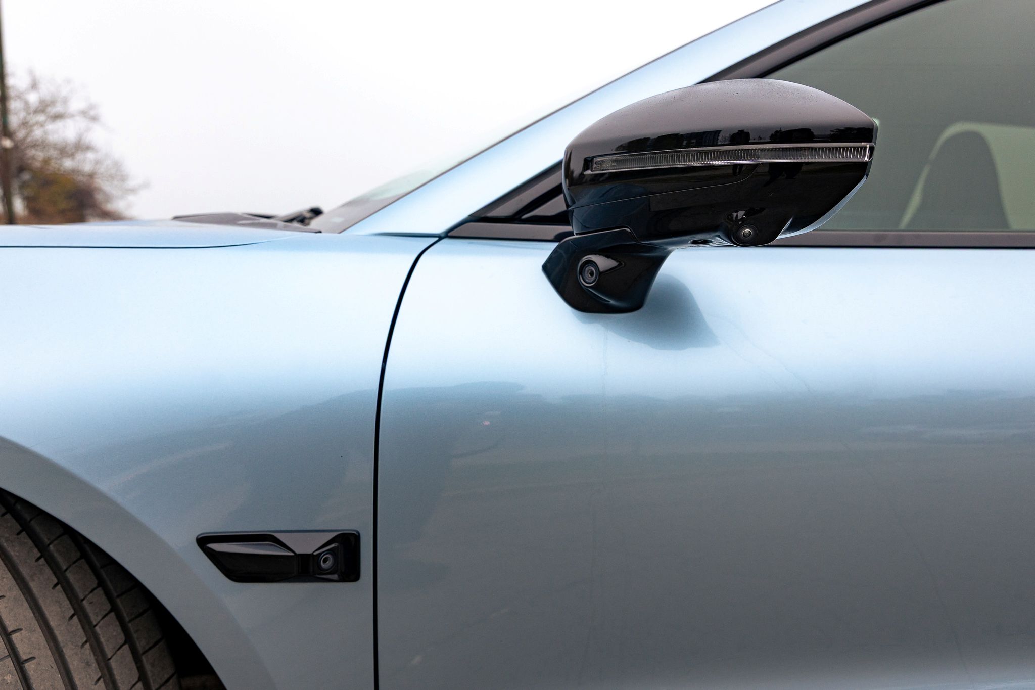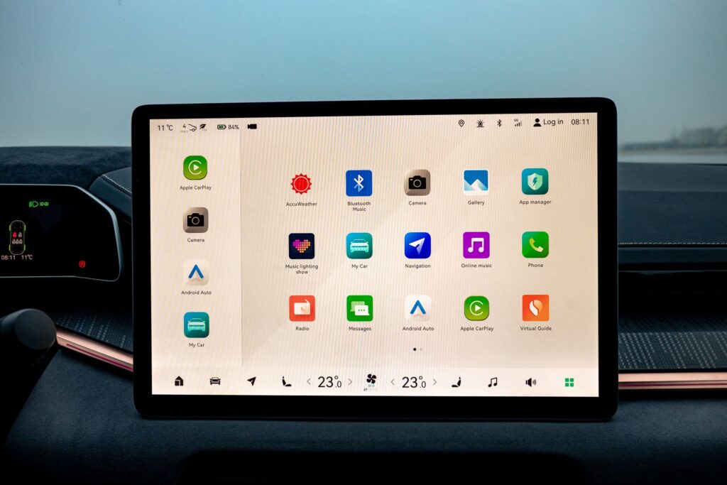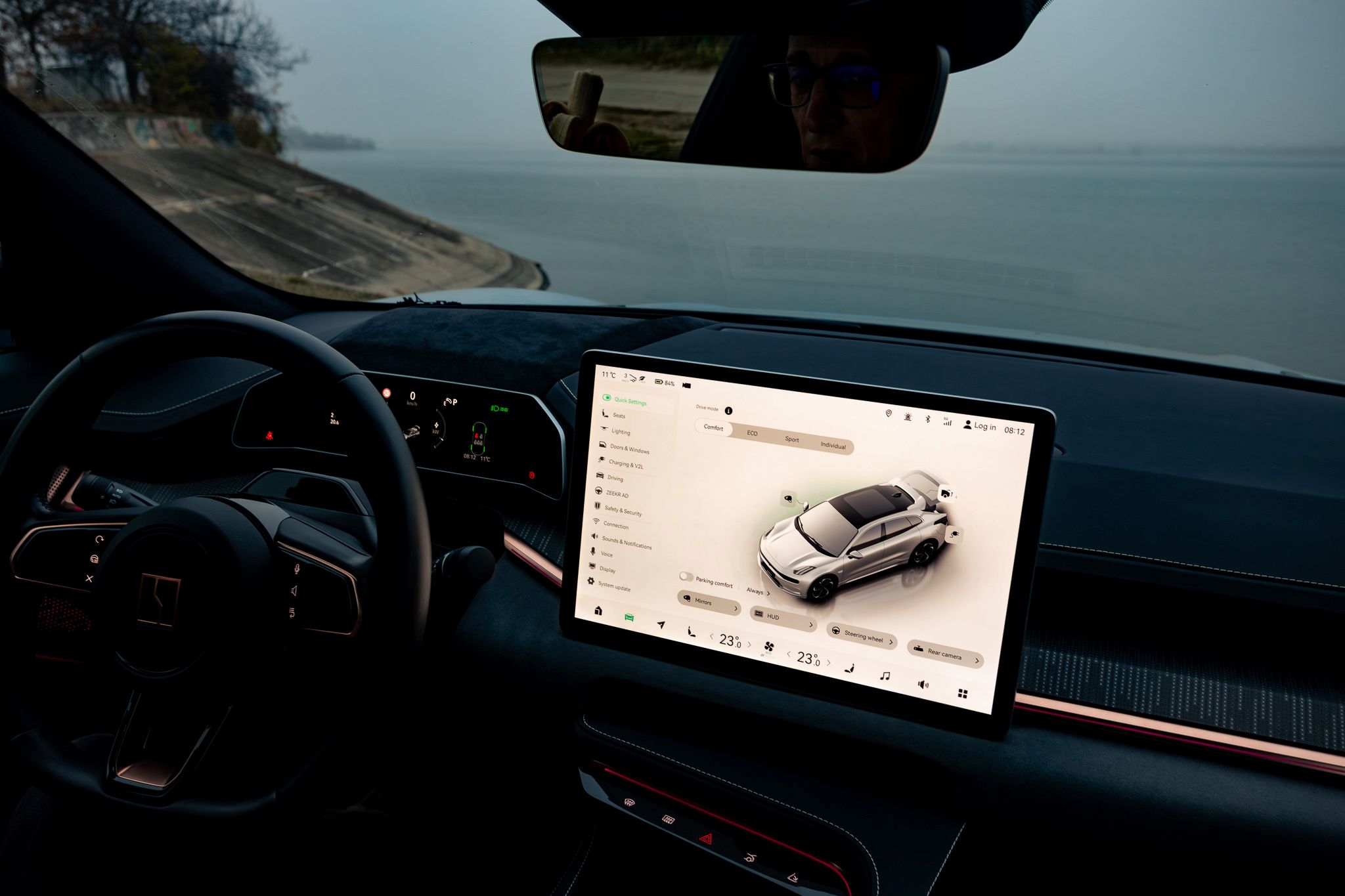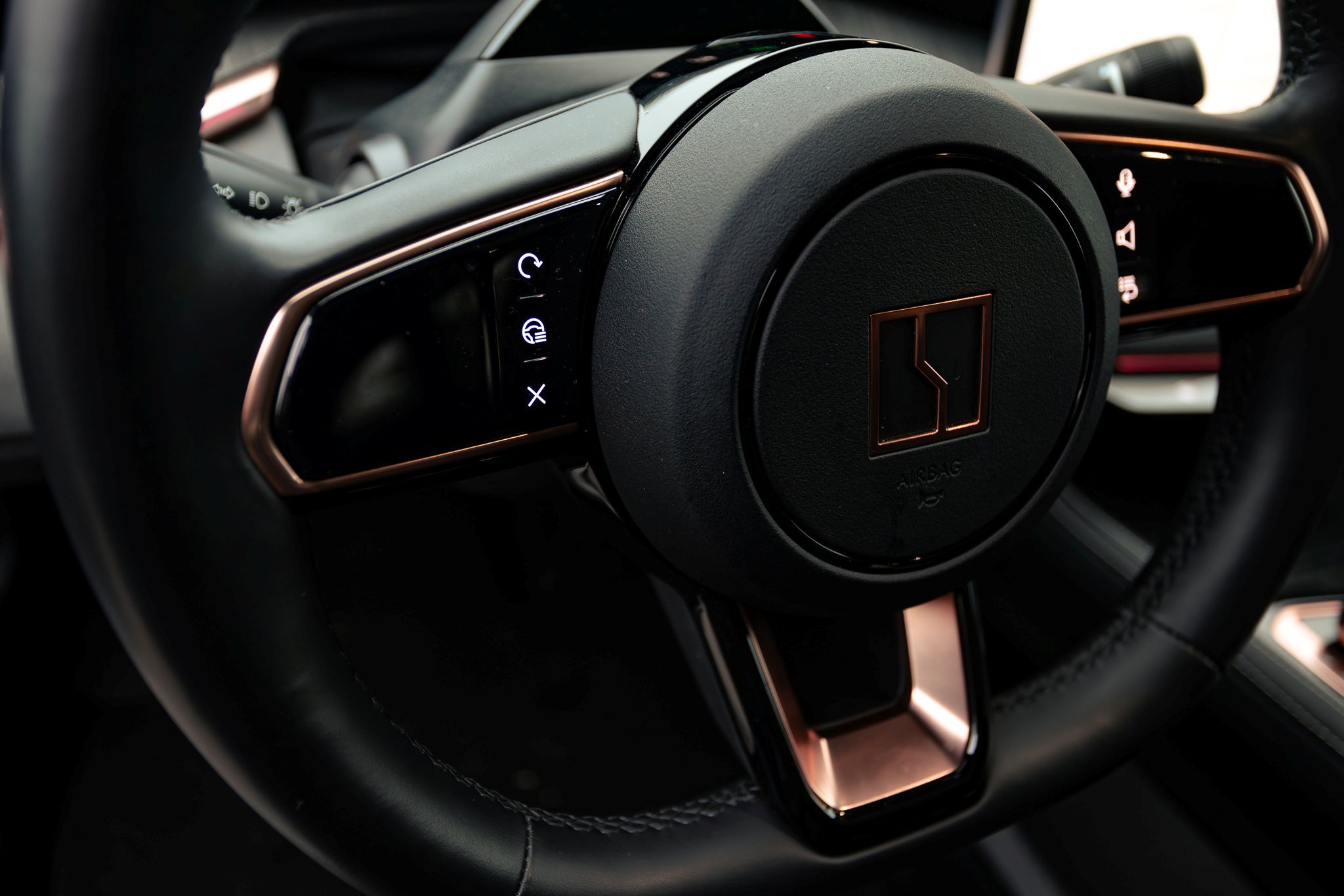 Volanul multifuncțional este prevăzut cu două pad-uri cu feedback haptic, care controlează oglinzile și poziția afișajului head-up de 14,7 inch. Acestea își schimbă funcționalitatea în funcție de ceea ce faceți, au un aspect plăcut, dar, din păcate, nu sunt marcate clar și există șanse să te încurci în ele mai ales în timpul deplasării. Un alt neajuns ale lui 001 constă în anumite meniuri ale uriașului display central de 15,4 inch, care sunt greu de găsit.