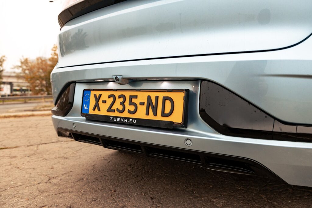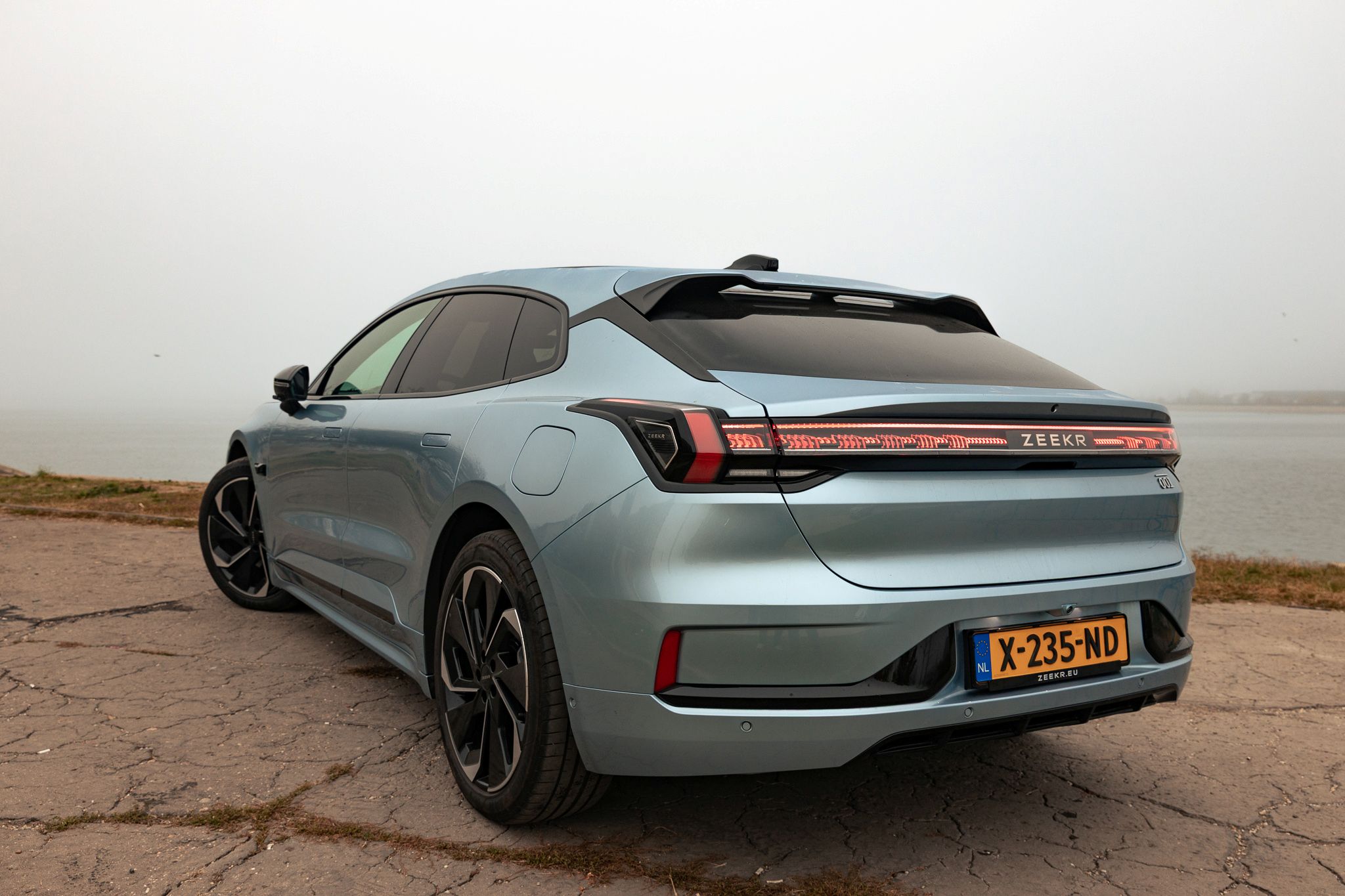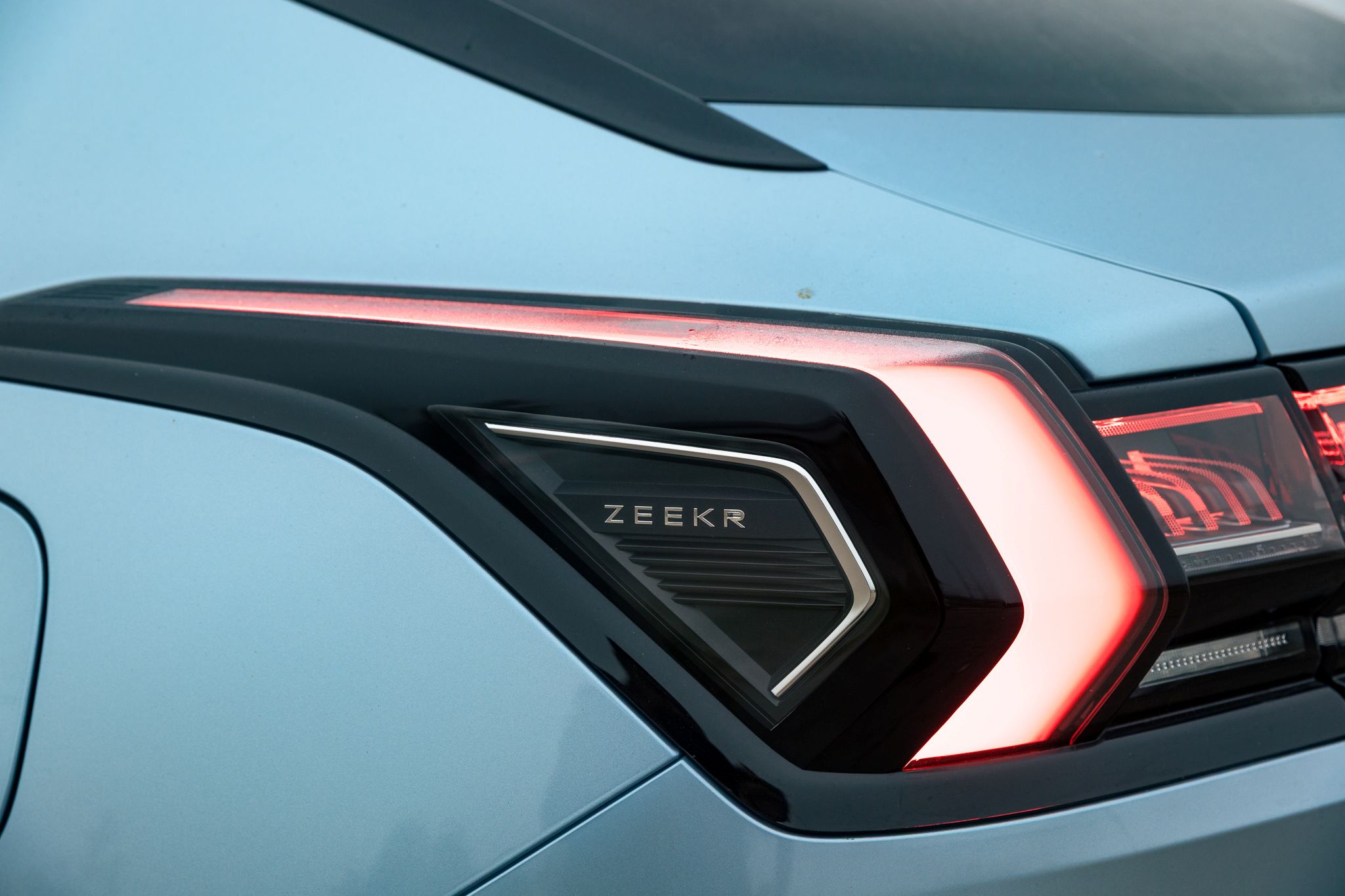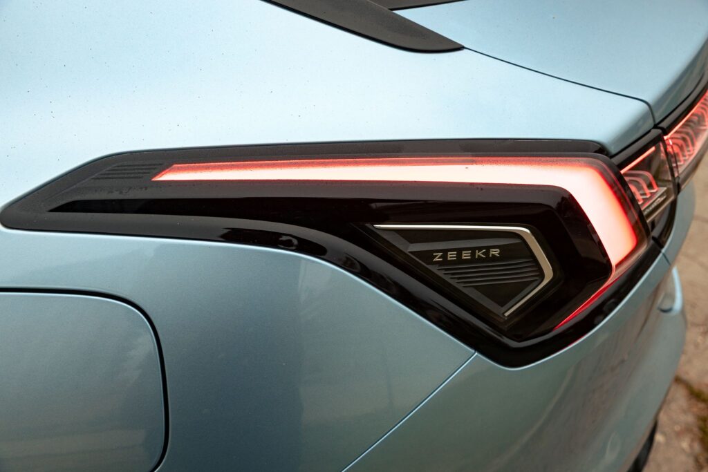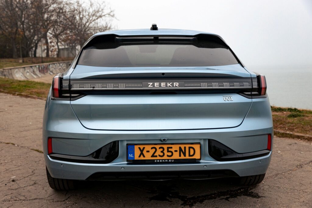 Partea frontală netedă și fără prize de aer, este preluată de la berlina Lynk & Co 03, care a venit pe piață inițial cu motorizări termice în urmă cu aproape un deceniu. Farurile proeminente „ca de broscuță” și grila frontală închisă îi oferă mașinii un aspect agresiv. Caracterul sportiv este întărit de consolele scurte față și spate, precum și de cutele din partea inferioară a portierelor. De asemenea, există și accente distinctive, cum ar fi logo-ul Zeekr iluminat de pe hayon-ul electric sau mânerele retractabile ale ușilor, care au devenit un „must” la EV-urile moderne. În plus, și sistemul de lumini este unul foarte reușit.