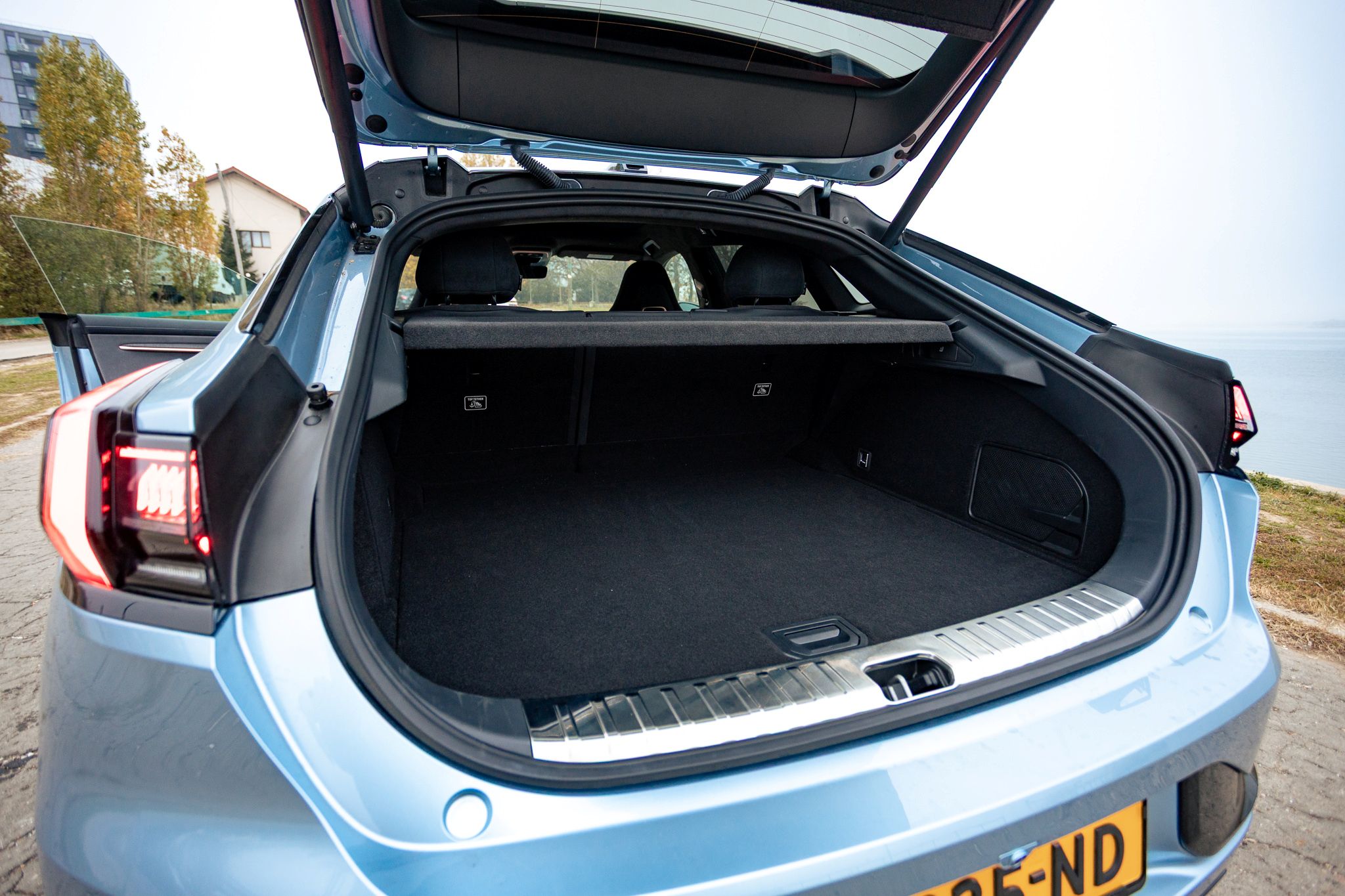 Portbagajele, însă, nu impresionează la fel de mult. Cel principal are 539 de litri cu toate scaunele în poziție normală, o valoare decentă, dar nu una de referință pentru un model care se prezintă cu o siluetă de shooting brake. Spațiul de depozitare din față (frunk) este foarte mic, abia putând găzdui geanta cablurilor de încărcare.