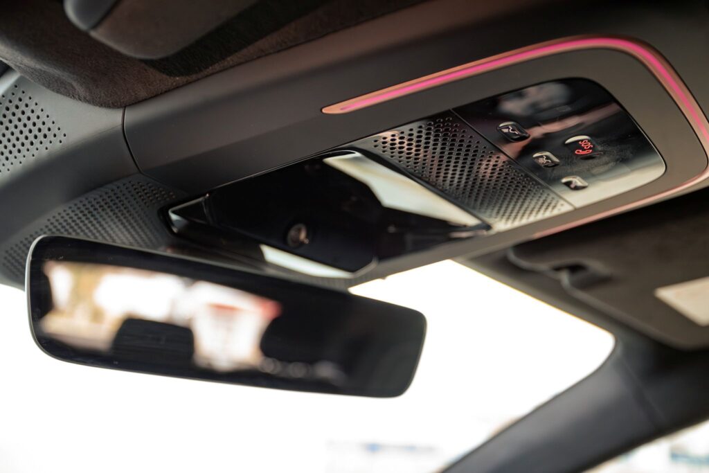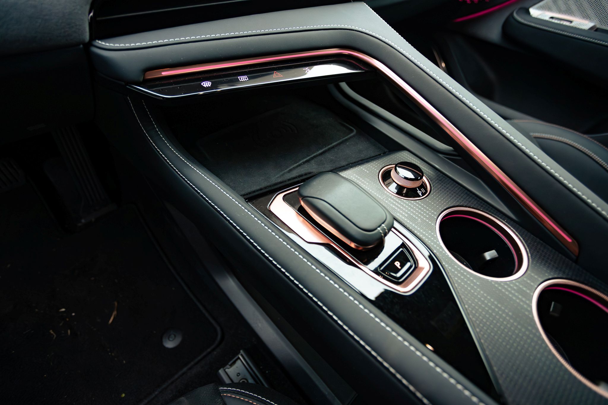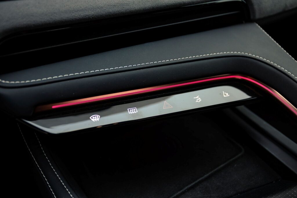 Panoul de instrumente de 8,8 inch este lung și îngust, bine iluminat și afișează clar informațiile. Capetele instrumentarului de bord sunt desenate ca niște aripioare, oferind din nou acea senzație de habitaclu concentrat pe șofer. Deși nu există comenzi fizice pentru aerul condiționat, există un buton metalic zimțat foarte plăcut pentru volum, cu funcție de oprire/pornire pentru redarea media. În plus, selectorul cutiei de viteze este mic și foarte elegant și prezintă aceleași detalii metalice pe lateral, fiind acoperit cu piele Nappa.