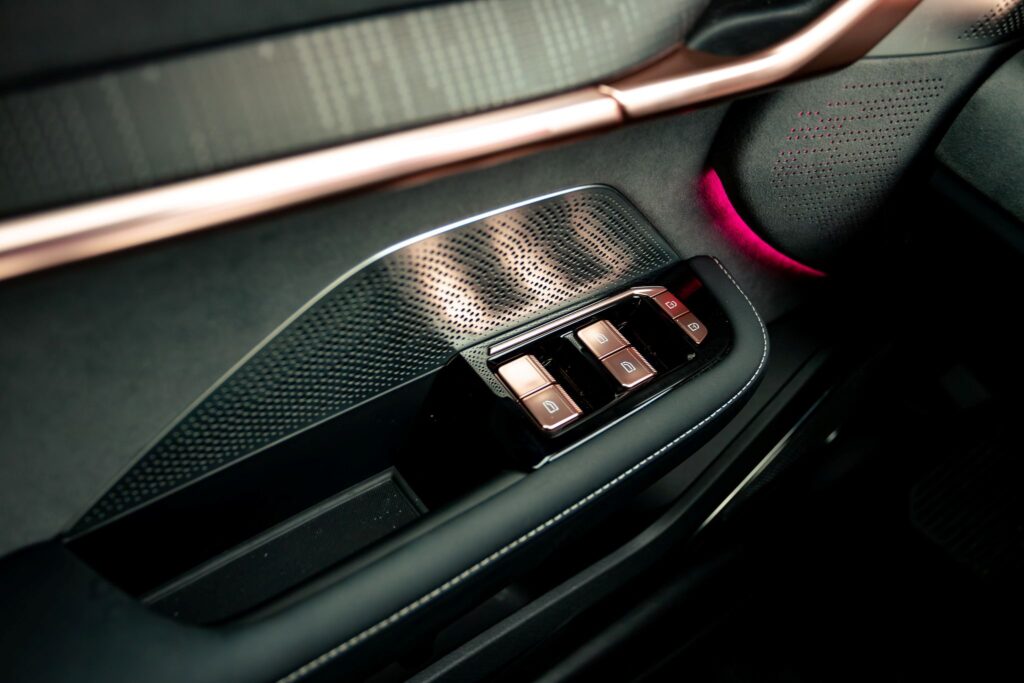 În pofida unei cabine de nivel premium, încă mai este loc de îmbunătățiri. Plasticul din partea inferioară ar trebui să fie mai rezistent, deci mai puțin aspru. Poate ar trebui umblat și la ornamentele metalice care, deși arată grozav, se simt ca plasticul la pipăit. De asemenea, și comenzile ar trebui regândite. Obsesia actuală de a avea guri de ventilație și oglinzi laterale controlate prin intermediul ecranului multimedia ne face să plângem. Este ca și cum ai inversa comenzile de pe touchpad-ul laptopului, făcând totul inutil de complicat. În același timp, panoul de butoane tactile de deasupra zonei de încărcare wireless pentru smartphone se pot atinge accidental foarte ușor, așa cum am constatat în momentul în care am atins din greșeală butonul pentru deschiderea portbagajului. Norocul meu că eram oprit la semafor…