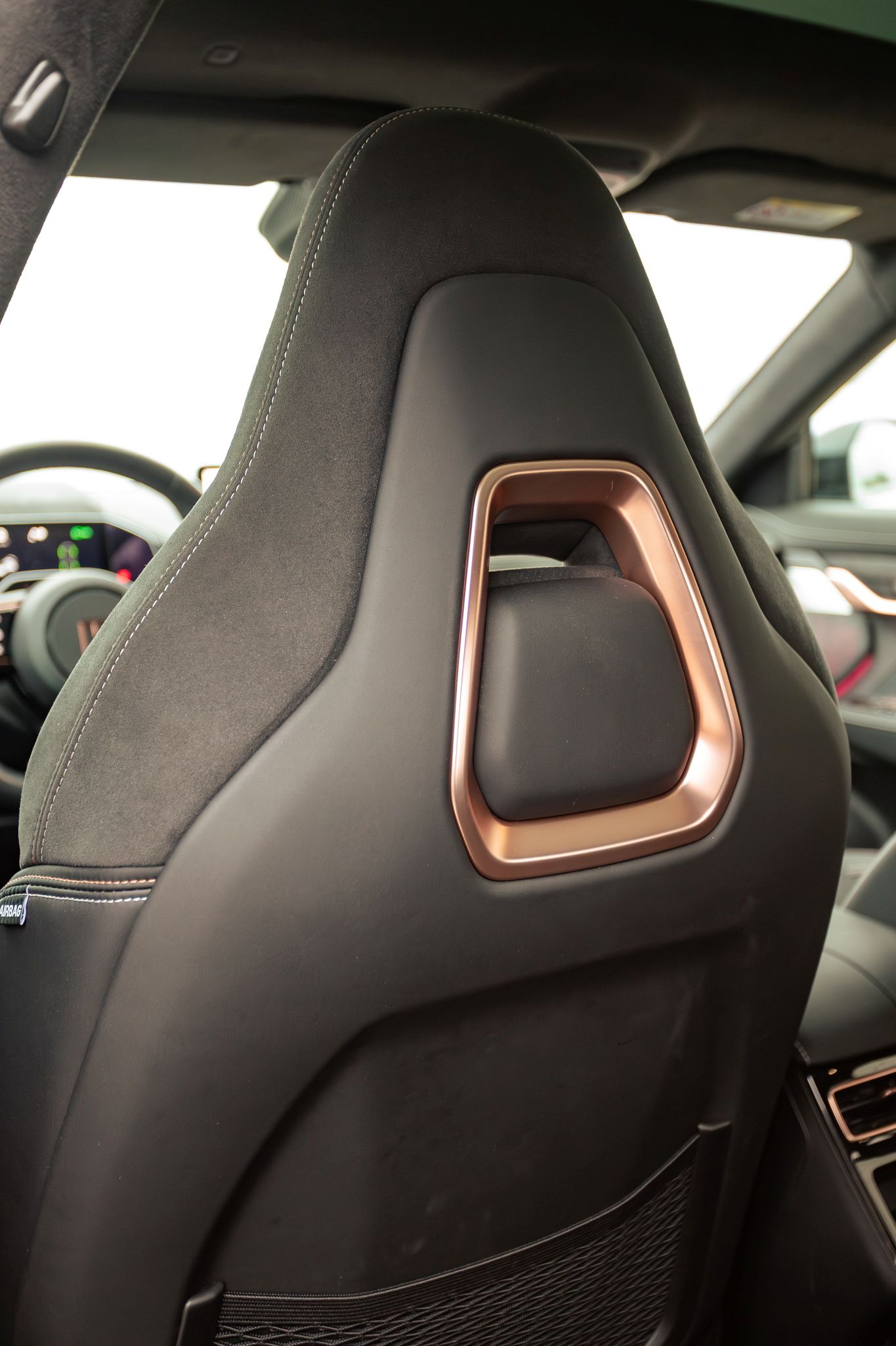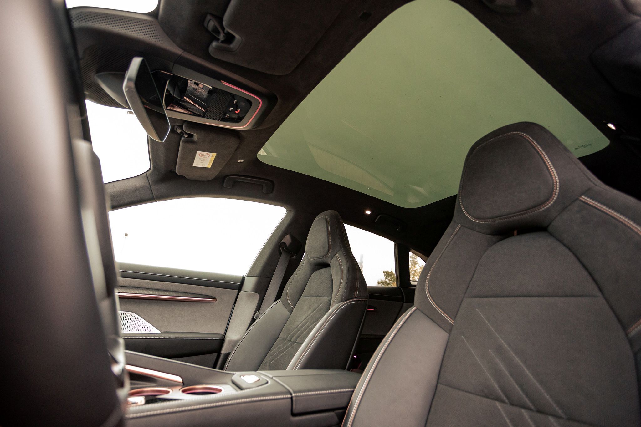 Spațiul pentru cap este decent, însă persoanele care au peste 1,85 m ar putea avea ceva probleme din cauza liniei plonjate a acoperișului. În rest, nivelul de confort este ridicat. Nivelul calitativ al materialelor și finisajelor din spate este identic cu cel din față, adică piele Nappa, Alcantara și suprafețe metalice extrem de plăcute la atingere.